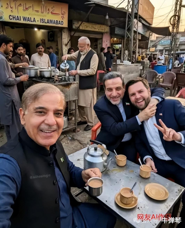 最后,看到一张明显是外国网友AI创作的照片:在伊斯兰堡地摊前,巴基斯坦总理夏巴兹请大家喝咖啡,伊朗外长阿拉格奇高兴地搂着美国副总统万斯的脖子,万斯则兴奋地比了个V字,远处,似乎印度总理莫迪还在倒咖啡提供服务……